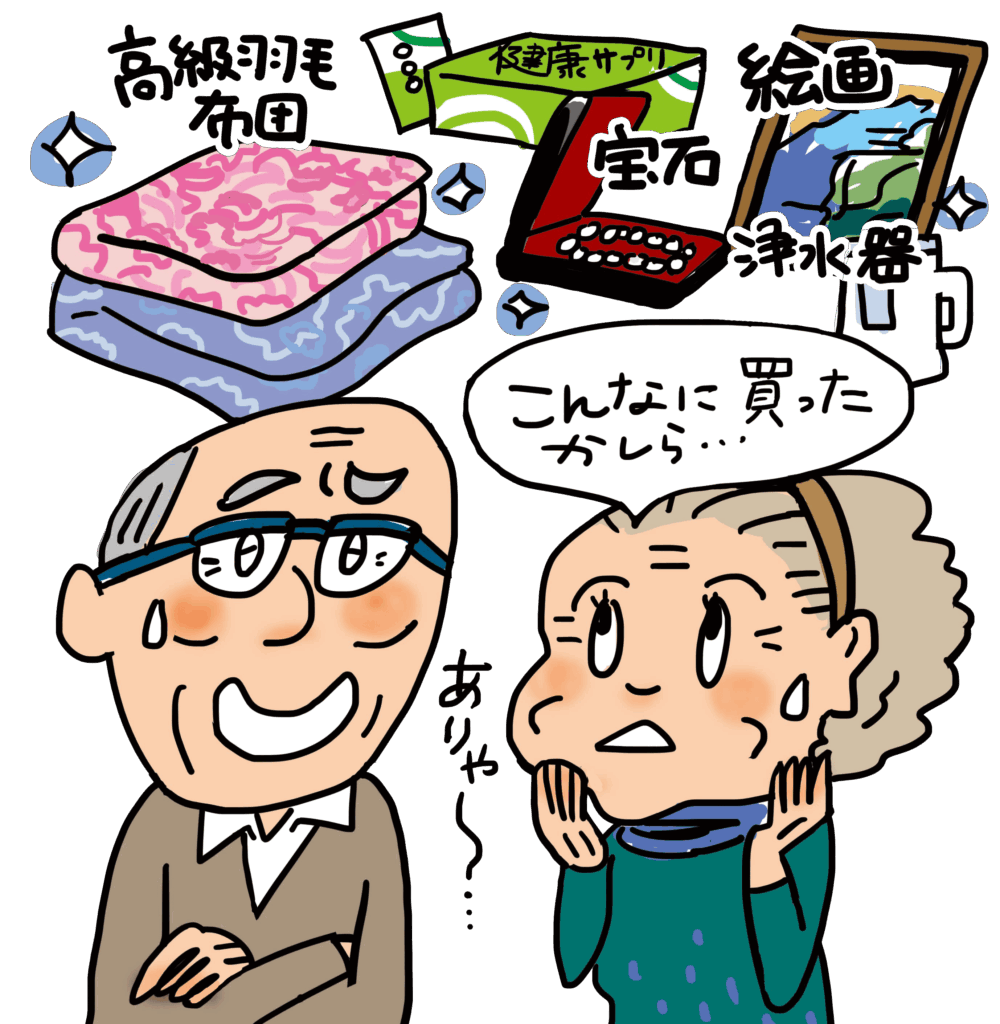 ケース① 認知症の診断を受けているA子さん。最近、訪問販売員が次から次に自宅を訪ねるようになり、その度に高価な羽毛布団や健康食品、必要のないものを買ってしまっているようです。後日、そのことに気付いたご家族がA子さんに状況を尋ねても、A子さんはほとんど理解していない様子・・・。